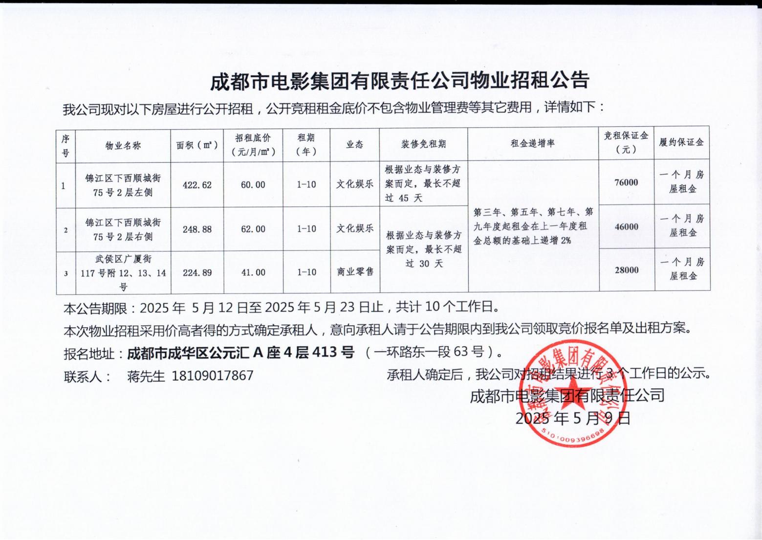 成都市電影集團有限責任公司物業(yè)招租公告
